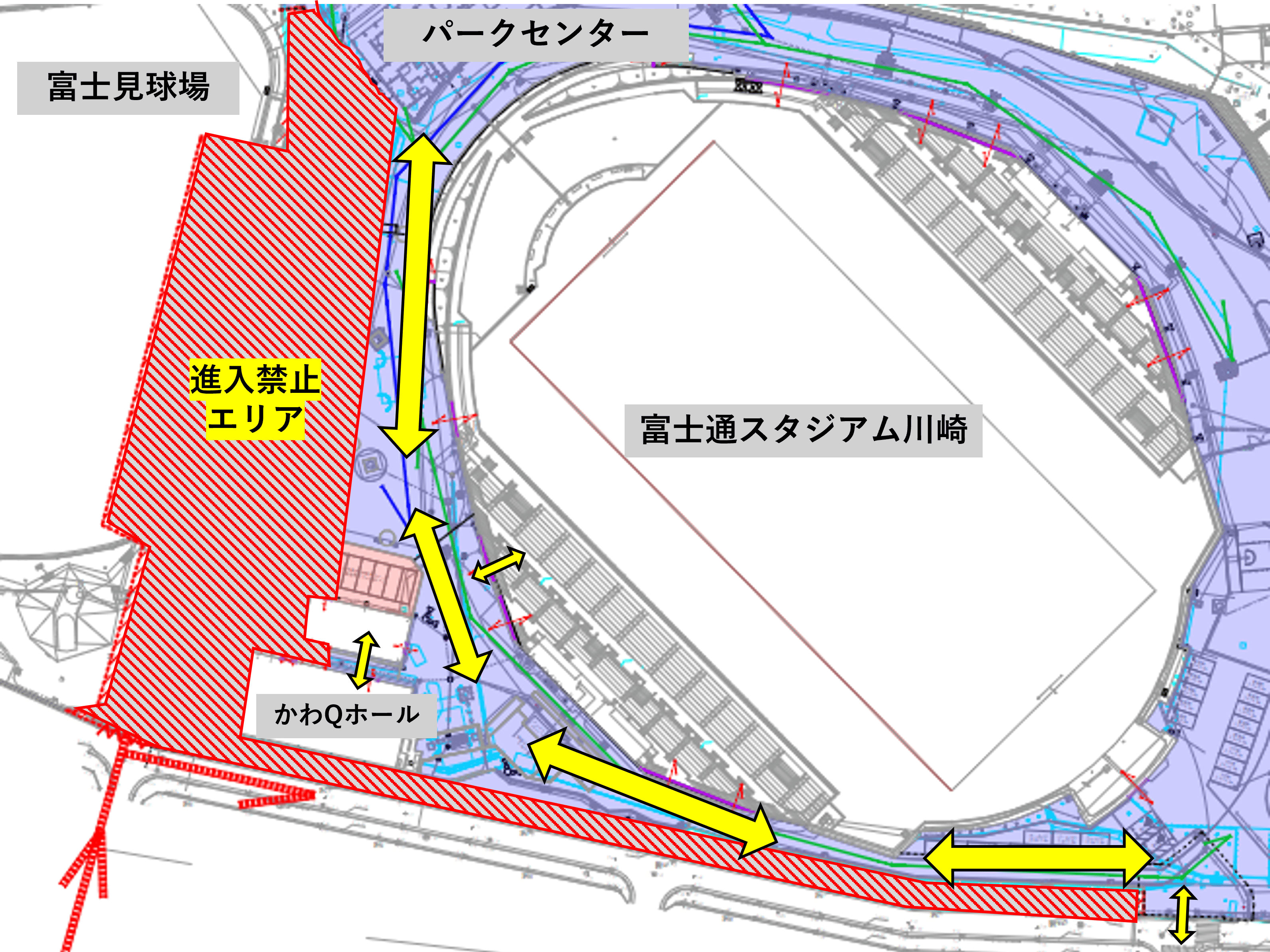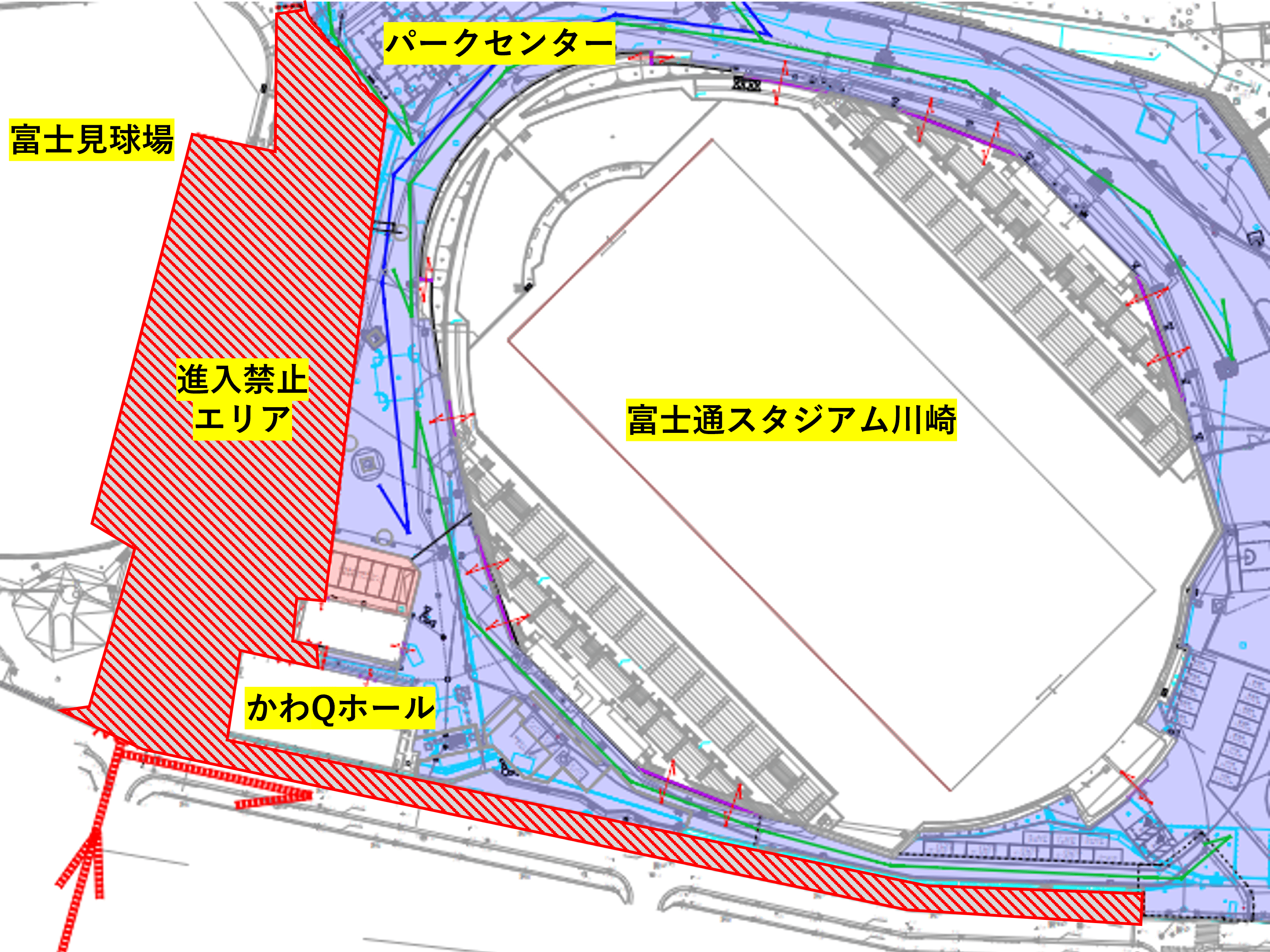 ※富士見公園南側のタンク広場入口からは、公園内ならびに富士通スタジアム川崎・かわQホールへ進入することはできません。