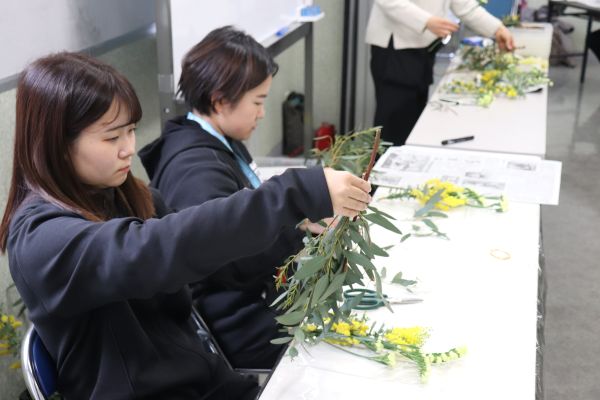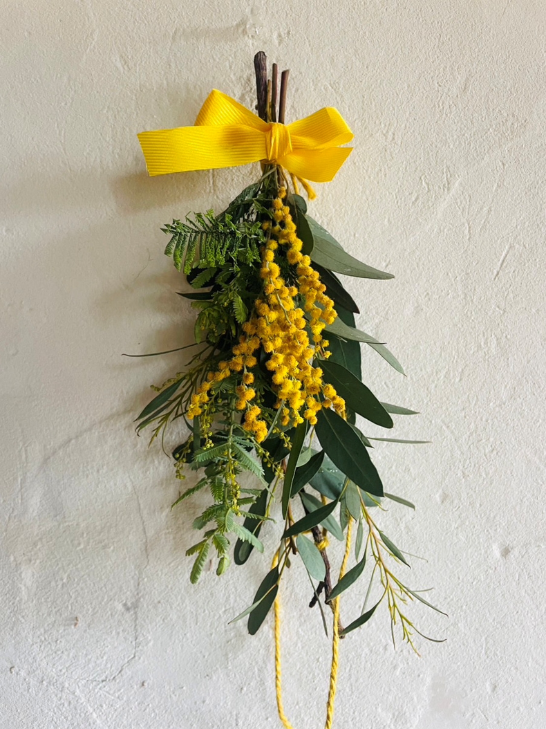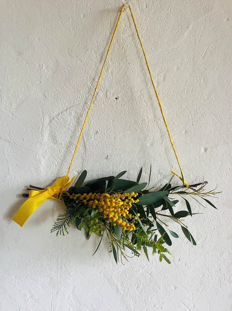 ミモザの花を使って、スワッグ作り体験を行います。
